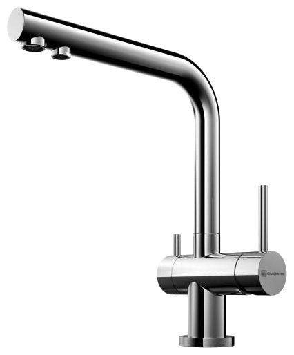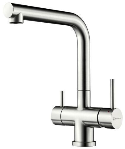 Single lever mixer with ceramic cartridge made of stainless steel with the same coating. After cleaning and applying a special liquid, the faucet in the kitchen will shine like new. The anti-corrosive material will last a long time, but it is not immune from minor scratches in the event of improper use and improper care. Horizontal installation on the sink and two switches - for tap and filtered water, eliminates the need to install a separate tap. The traditional L-shape of the spout facilitates washing dishes in any shape of the sink. The height of the tap allows you to wash small and large dishes without much effort. The tap can be installed on the bathroom and in the wide washbasin. The ergonomics are well thought out. Convenience and versatility are determined by the high price of the product.