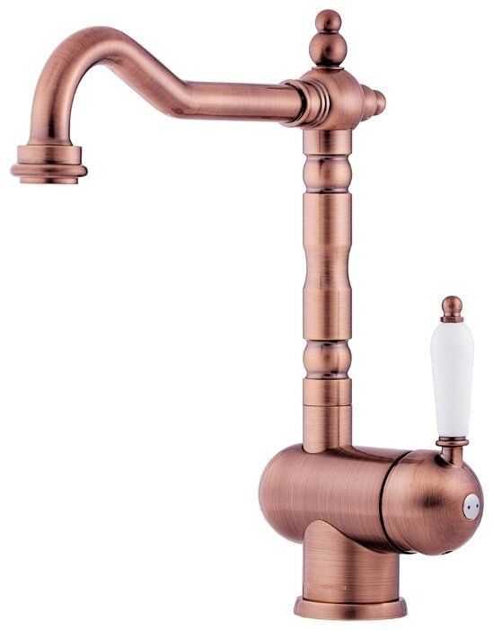 Model with one handle - lever, without switching to the water filter. Made in retro style. The brass body with a bronze finish will last a long time if handled carefully. Swivel spout. The mixer is equipped with a convenient additional function - a pull-out spout. This design allows you to solve the problem with splashes on the walls of the sink and around it when washing dishes and products. A mixer of this type can be used on the sink and on the bathroom.