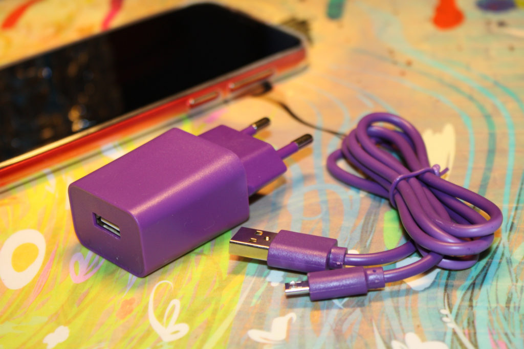 The package includes the smartphone itself, a protective silicone case with a bright print, a charger and USB cable in the corporate purple color, a user manual and subscription flyers, which we will discuss below.