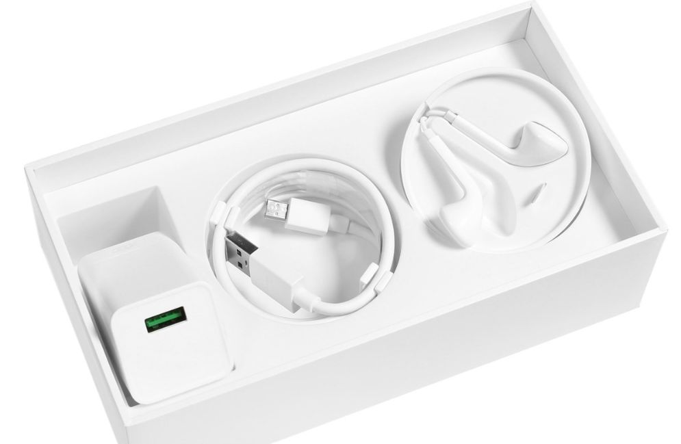 It comes in a rather large package, which includes the smartphone itself, a headset, a Micro USB cable (cord length is standard), a charger with support for fast charging VOOC Flash: voltage 5 volts, current strength 4 amperes, silicone case and a needle for removing the SIM.