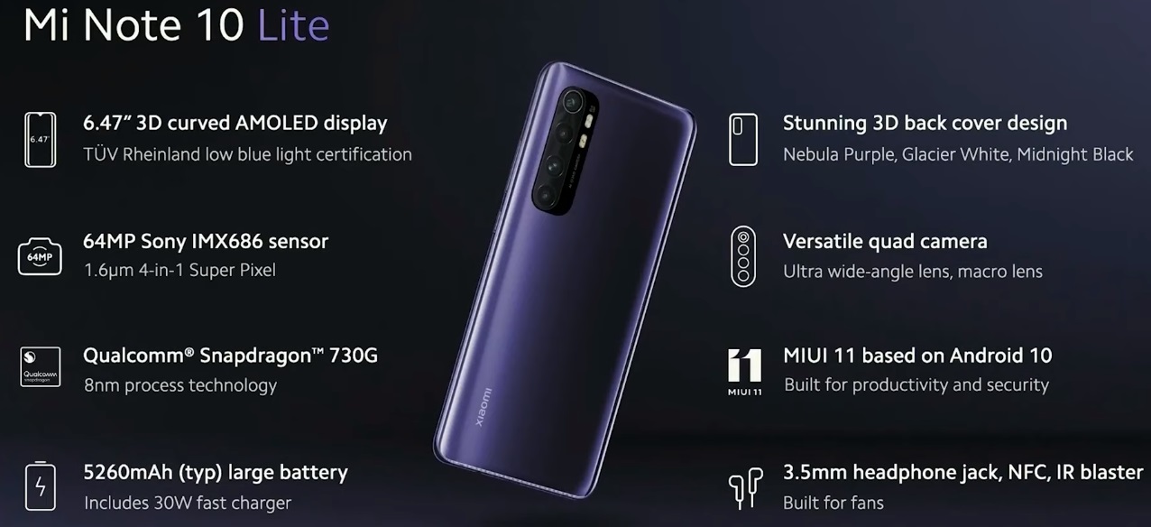 The Mi Note 10 Lite does not have stereo sound, but the mono speaker and Hi-Res Audio profile reproduce audio files cleanly and vividly in high quality. The built-in equalizer with presets and audio profiles allows you to create individual settings for a comfortable sound and decode many popular formats: AAC, AAC +, AMR, AMR-WB, eAAC +, FLAC, MIDI, MP3, OGG, WMA, WAV.