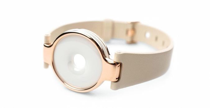Design: leather strap with adjustment, attaches directly to 2 sides of the gadget. The main element of the bracelet resembles the image of a donut: the circle and the "ears" for the strap are metallic, golden in color, the inner part is glossy. The contour is the holder of the main part of the jewelry, which can be opened (like a pendant) and removed the middle, which is responsible for all the clever functions. The bracelet is available in two colors: white and black. Purpose - for the female half.
