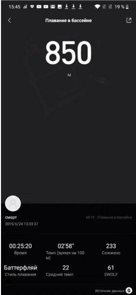 As for the error-free calculation of the covered distance, it is not the worst when compared with competitors, but not the best either. The expert swam three dozen pools of 25 m, which in total amounted to 750 m. The bracelet gave 850 m in the statistics, in other words, increased the final total by 100 m. Consequently, there is an inaccuracy of 13-14%.