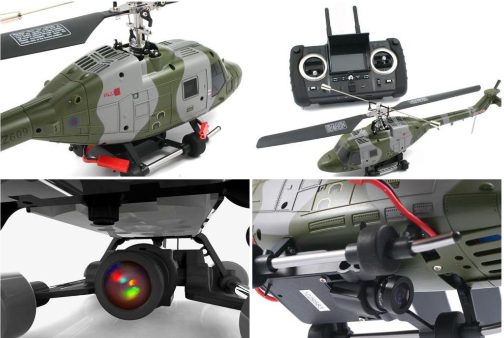 The length of the helicopter is 34.2 cm, the flight weight is 0.2 kg. The screw scheme is a classic. The four-channel console adjusts the pitch, pitch, roll, heading. The signal is transmitted at 2.4 GHz. Feature - two launch options - for beginners and experienced pilots. It must be remembered that the car cannot cope with strong winds. You need 8 AA batteries to work.