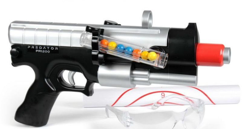 The pump-action kids paintball marker does not need air and is ready to use. The clips with gelatin balls are enough for 15 shots.
