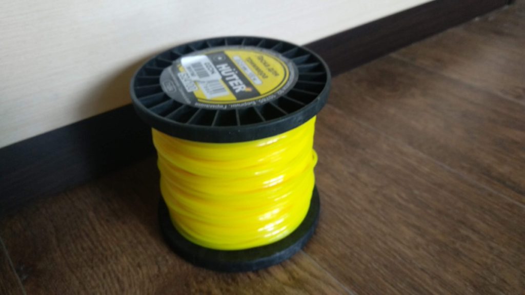 The cutting device is fed into the trimmer head. The basis of the working element is a polyamide string coated with a polymer that is not inferior to it in strength. The length of the line is 15 m, the configuration is a twisted square, it has a high coefficient of wear resistance.