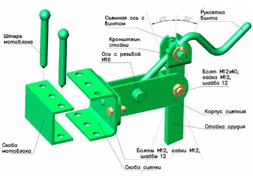 The clutch mechanism allows you to fix the attachment + trailer to the walk-behind tractor, provided that the connecting brackets of the walk-behind tractor and the adapter fit each other in diameter.