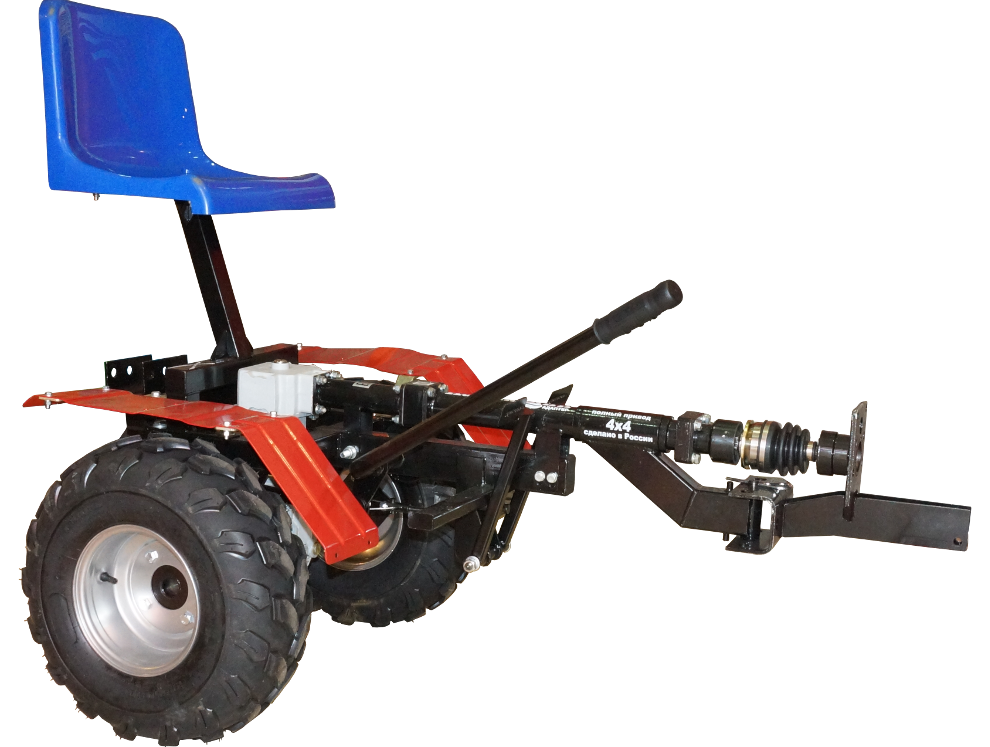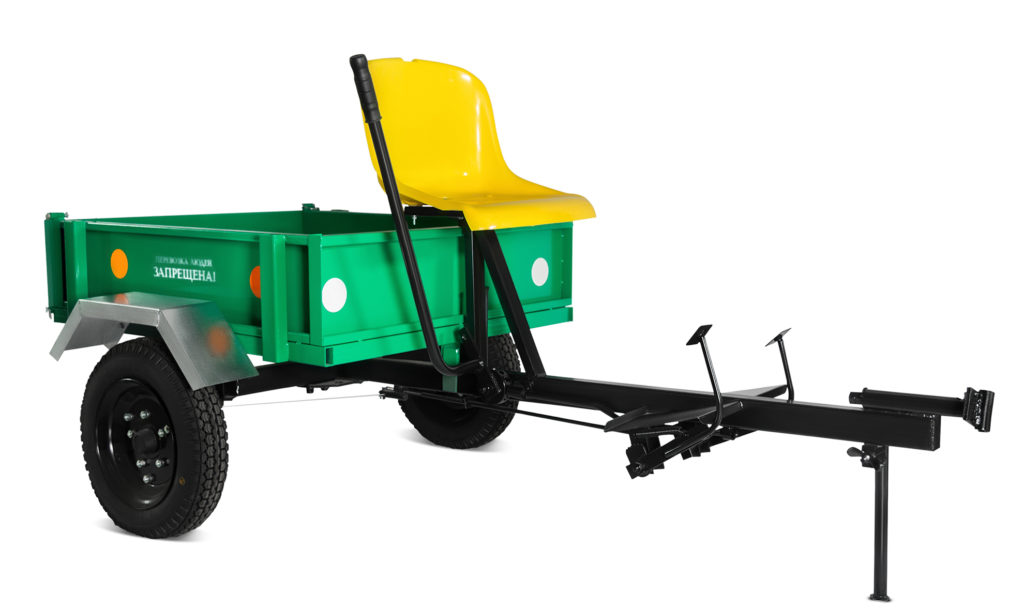 AM-2 has almost the same general characteristics as the already mentioned "Celina", although it has a higher cost. Complete with wheels 4.00 x 8, 4.00 x 10, 5.00 x 10, 5.00 x 12. It is used with any walk-behind tractors over 4 kW (for MTZ, Motor Sich, Grasshopper and others). Has steering, 3 pedals for clutch setting and reverse gear. The gas throttle is installed, the ability to install active attachments is available.