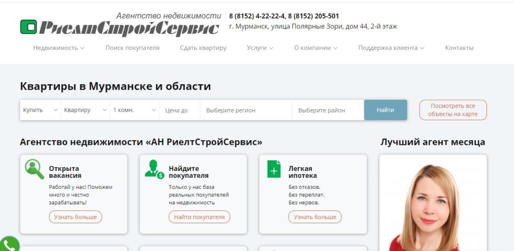 A small agency that has been operating for about 5-6 years. Carries out the purchase and sale of real estate in Murmansk and the Murmansk region. They prepare the selling photographs of the object, compose and place advertisements, handle the traffic of incoming calls and perform many other functions necessary for solving the client's problems. Interact with banks, notaries and other third parties.