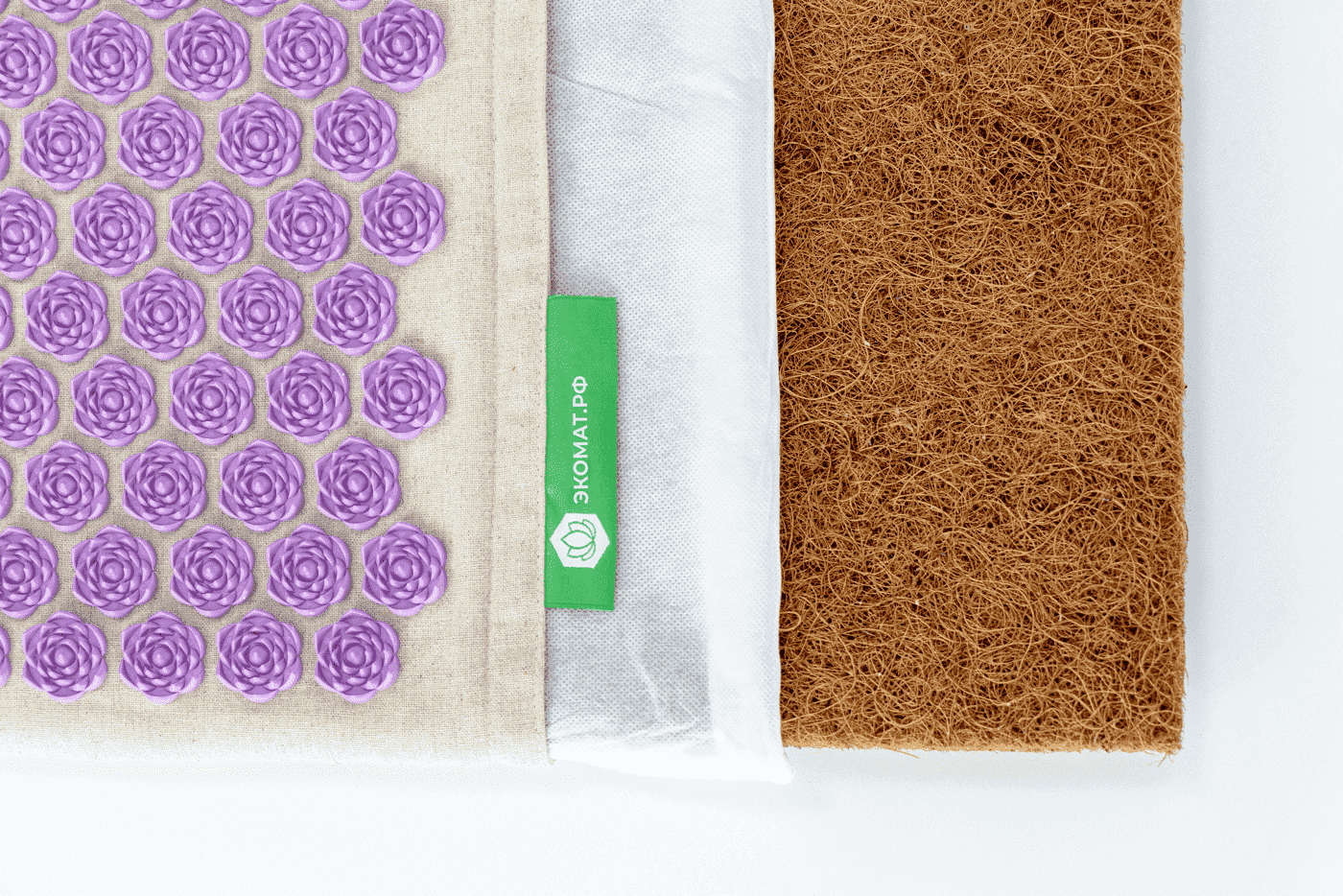 A modern, unique design made from high quality organic materials (cotton, linen, coconut fiber and HIPS plastic). Hypoallergenic materials are safe for the human body. The needles are rosette and lotus-shaped. This arrangement has its own uniqueness and is patented by the manufacturer. The invention has a good effect on relaxation and stress relief in the body. It is enough to lie down on the mat for 15-25 minutes. To increase the impact force in problem areas, it is suggested to put a towel or roller in this place.