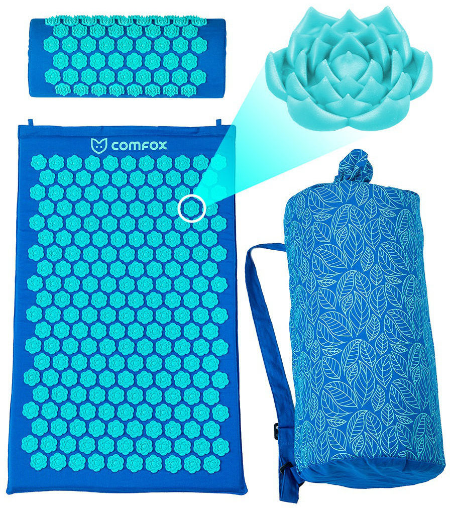The massage mat has a memory effect. The set includes a massage roller under the neck and a cotton bag for easy movement.