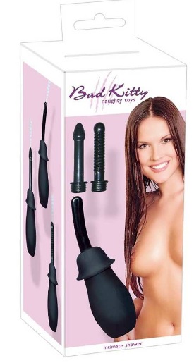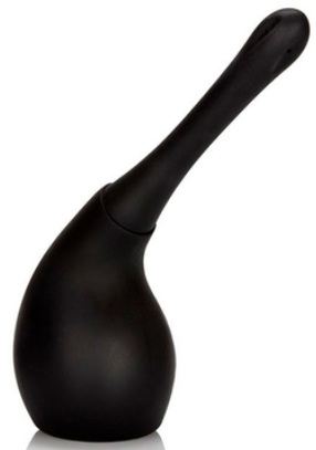 Intimate hygiene shower for anal and vaginal use before and after intimacy with a partner.The product consists of two parts: a container for filling liquid and a nozzle with a smooth surface. In its shape, the accessory resembles a phallus with testicles, at the moment when the partner is on top of the partner, leaning forward a little. The rounded head provides a comfortable insertion into the anus.