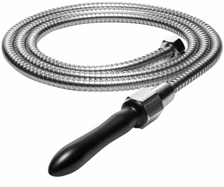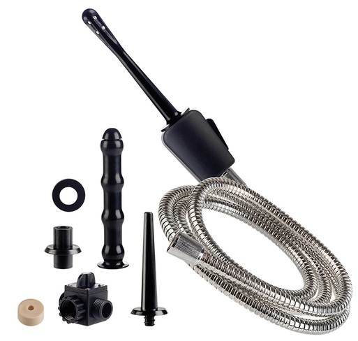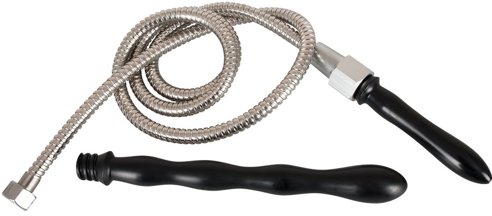 An accessory for preparing for anal sex with a partner. It is equipped with a mechanism that regulates the access of water, as well as a thread for installation on a hose instead of a regular shower. The tip is elongated, masonry, the tapered head has holes for the liquid to escape.