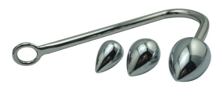 Design for adult men from the manufacturer "NoEnName_Null" to massage the prostate. Suitable for same-sex partners in love games. The set includes three drop-shaped tips of different diameters of a metal alloy with a mirror coating. The hitch is rigid with a ring at the end for easy extraction, curved at the base, to which the attachments are screwed.