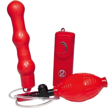 Vibration plug-expander from the Orion brand in red with a rectangular control panel. It is inflatable, the working area is equipped with three balls of the same volume, which are located at a certain distance from each other. The device operates on batteries, the vibration speed is regulated.