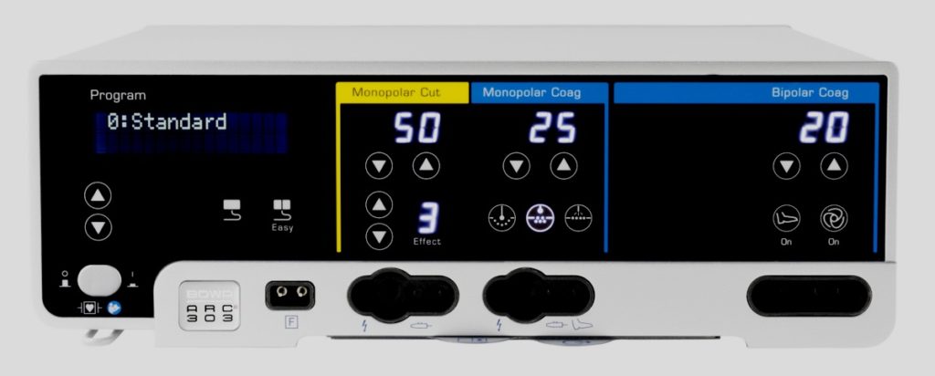 Electrosurgical apparatus with LCD display is a system that is used during operations in any field of medicine. It features a wide range of specialized and classic modes, intelligent control of the RF signal programs, and the Auto-Stop function. Equipped with two monopolar and one bipolar channels, a simple and intuitive control system, an interactive visual warning system. Able to save 100 sets of settings.
