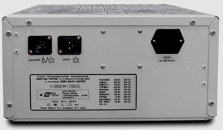 The device is equipped with bipolar forceps of non-stick type of different configurations, all kinds of clamps. Weighs 9 kg, rated power 400 W.
