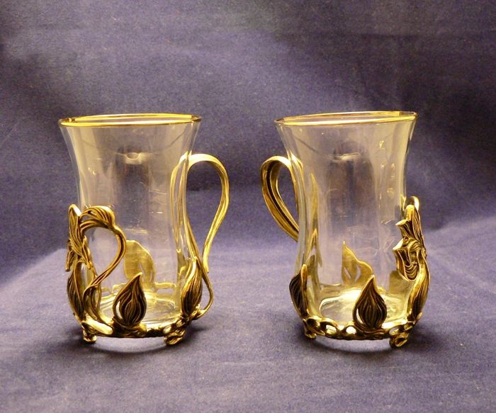 Cup holders are made of brass and enamel, glasses are made of glass, the set includes a saucer. The cup holder was created by hand. Price: 2790 rub.
