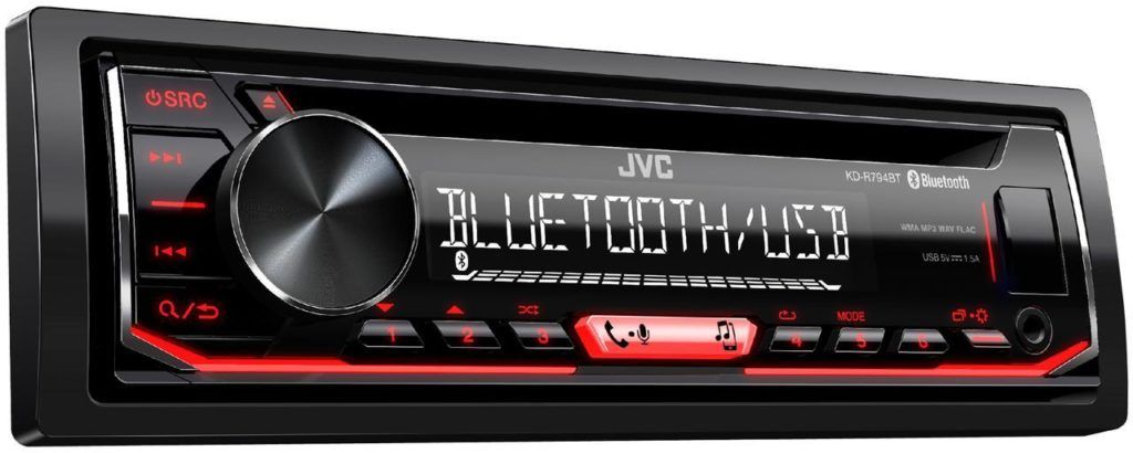 | 6 | JVC KD-R794BT | Country of origin - Thailand, average cost from 5580 rubles | Supported formats: CD-Audio, MP3, WMA, FLAC Size 1 DIN Maximum power 4x50 W The number of output channels is 2 (PreAmp, subwoofer). Dimensions: 182x53x158 mm | SD-disc slot, amplifier, equalizer, display - monochrome, removable panel, Bluetooth, own application - JVC Remote App, which allows you to control the device |