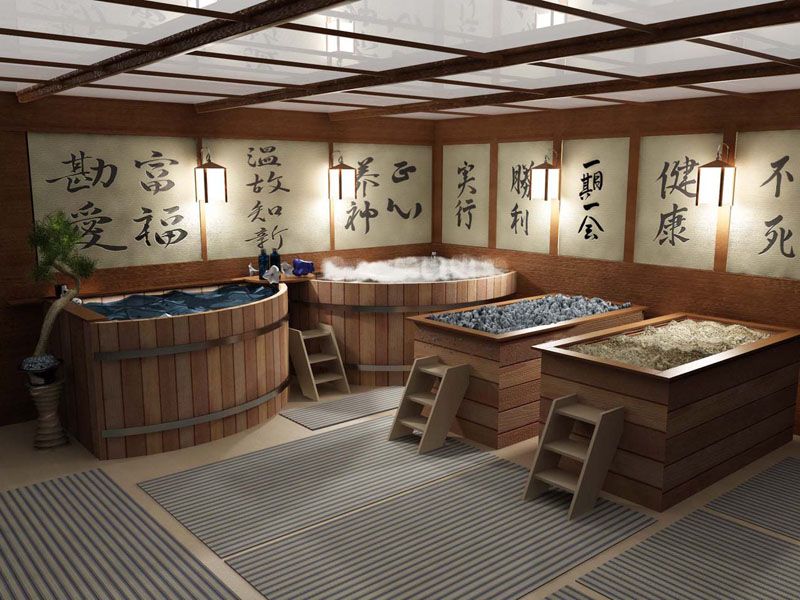 The most unusual type of bath, which is divided into two types: public (sento) and individual (furo). Furo is a small pool (or barrel) for one person with water heated to the desired temperature, usually up to 50 degrees. At the same time, the air in the room with the tank is heated to 30 degrees. There is a special seat inside the barrel so that the water level does not reach the chest, and medicinal herbs and solutions are added to the water. The Sento is a spacious multi-person swimming pool that is kept perfectly clean. The water is constantly changing, and you can only dive into the pool after taking a shower.