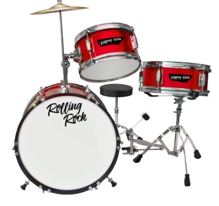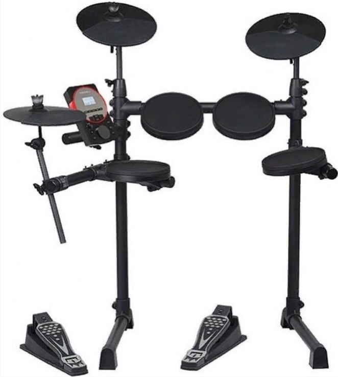 The delivery set includes everything you need: 3 toms, a snare drum, a barrel, Hi-Hat and Crash cymbals, stands, a pedal, a chair, a pair of sticks, which makes the task easier for the rider (does not require additional waste of equipment).