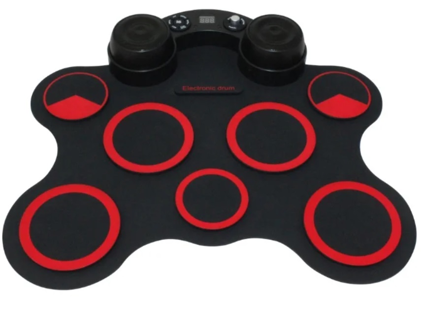 The 7-reel plug-in model comes with sticks and a connecting cable - a good option for honing your playing skills at home. The body is made of silicone, equipped with two built-in speakers, each with a power of 2.5 W, 2 auxiliary pedals (bass drum, closed hit-hat) and various programs. The firmware contains 3 different rhythms, 6 demo compositions and sound styles (pop, rock, electro, funk, jazz, latin,). The built-in display shows all information about the settings. Net weight of the panel - 1 kg 200 g. Body color - black + red.