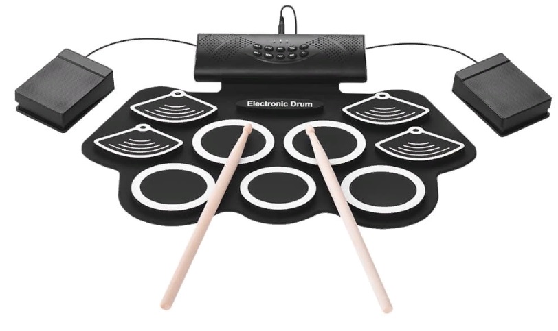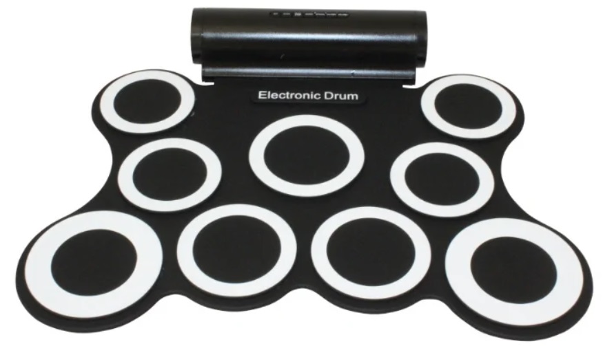 Instrument with ready-made melodies: 3 rhythm options, 8 demo songs and 5 sound styles (pop, rock, latin, electro / edm, percussion). It can be purchased for beginners in the field or for children. The body is made of silicone, equipped with 9 drums and two auxiliary pedals (bass drum, closed hit-hat). The delivery set includes a connecting cable (mains supply) and sticks. The mass of the entire structure is 1 kg 200 g.