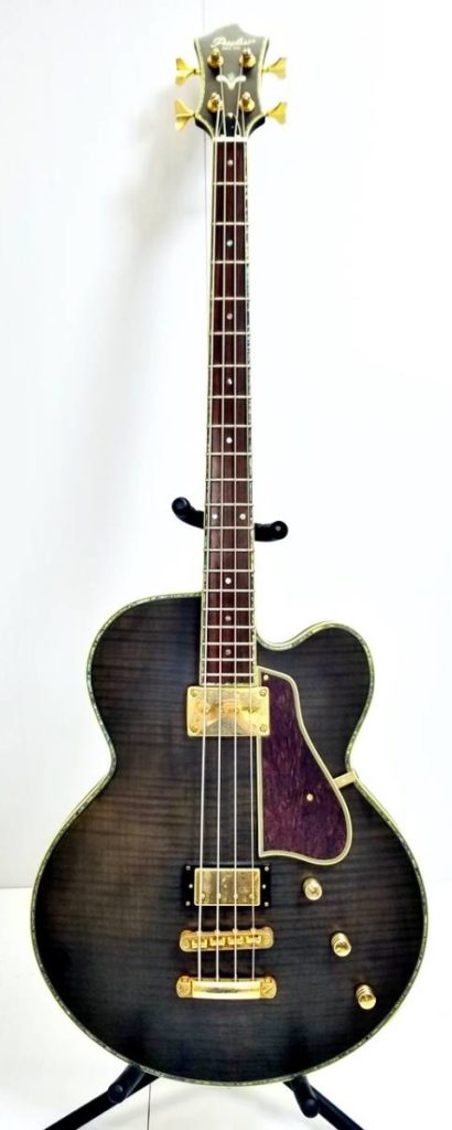 This is a top class bass guitar. It is made of laminated maple and the neck is made of laminated wood. The central block is made of mahogany. The deck is edged with a three-color stripe (black, ivory, mother-of-pearl). The top case is covered with matt polish and varnish. The neck is glued to the body at the 15th fret. The fretboard is made of rosewood and also features a triple edging. The setting mechanism is gilded. The guitar comes with a leatherette case.