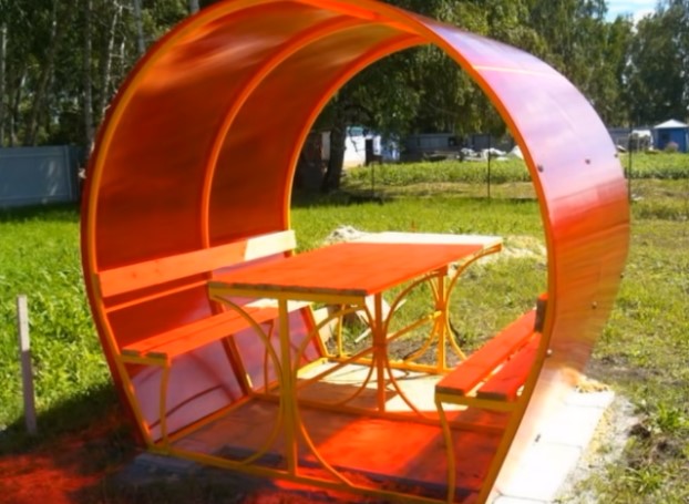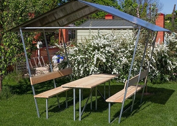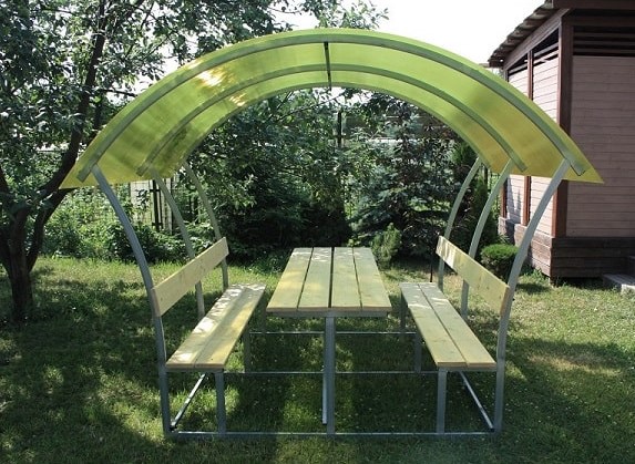 An excellent option for an inexpensive open-type gazebo for summer vacations made of galvanized profiles and a gable roof made of cellular polycarbonate. Suitable for a site with a small area due to its compact size. Despite the low cost, this is a high-quality product: the profile is protected from corrosion, the table and benches made of planed boards are treated with an antibacterial compound. The color of polycarbonate for the roof can be chosen from any of the palette offered by manufacturers. The structure will not save you from strong winds and downpours, but it will reliably protect you from summer rain and hail. If desired, you can quickly disassemble or move to another place on the site.