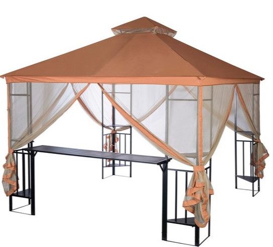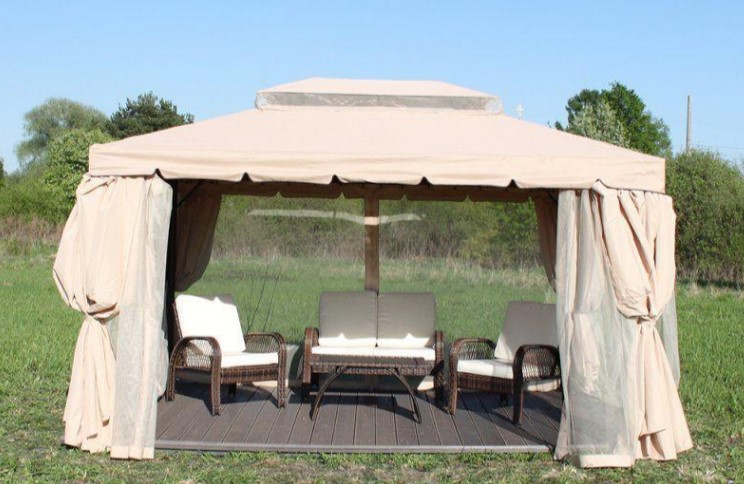 A reliable, practical model with mosquito nets with zippers around the entire perimeter will save you from heat, insects, and rain. Thanks to its graceful square shape, a hipped roof, an awning with a ventilating superstructure, light metal supports, it will decorate any summer cottage. There is a built-in bar counter, corner triangular tables. Perfect for buffets.