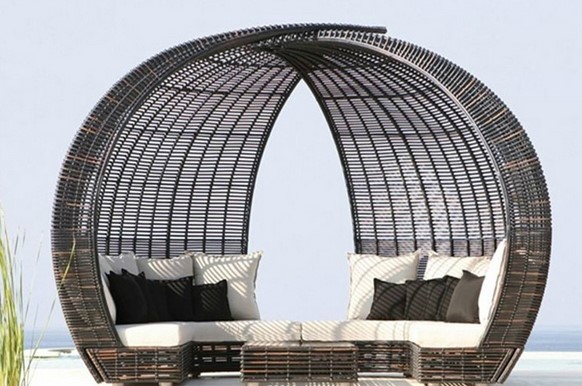 An original wicker lounge gazebo for a summer residence of Spanish production made of artificial rattan on an aluminum frame is a place for a comfortable rest for a large company of 8-10 people on comfortable sofas. The material is environmentally friendly, safe, withstands temperatures from -70 to +60 degrees, does not absorb dirt. The set also includes a table and cushions made from durable, water-repellent, sun-fading textiles with soft filling.The hand-woven frame creates a lace shade, pleasant on a hot summer day. Comfortable wide sofas with soft elastic cushions will allow you to sit comfortably over a cup of coffee for a friendly conversation or a family afternoon relaxation. The manufacturer guarantees a product service life of over 20 years.