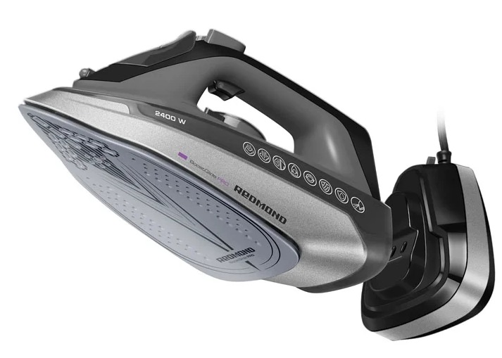 Such a device from the Redmond company is not just an iron, but a 3D iron that has many functions. Its main feature is the ability to use both with a wired connection to the network, and wirelessly using a charging stand. This makes it easy to iron both bed linen and clothes with many elements, where it is necessary to turn the device in different directions.