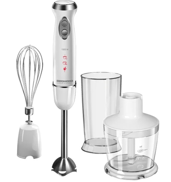 This model, thanks to removable attachments, combines a mixer, blender and chopper. Using the whisk attachment, you can prepare cream, dough, eggs or cream. With the hand blender, you can make not only smoothies and cocktails, but also baby food puree, pâté or mousse. In the chopper bowl, you can easily grind nuts, chop herbs or vegetables. With this configuration, Redmond RHB-2972 can be an excellent alternative to a food processor, only it takes up less space in the kitchen.
