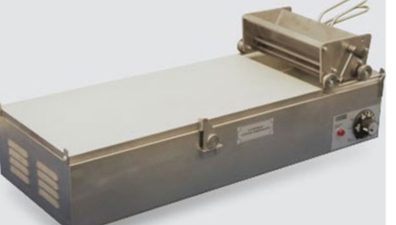 Installation for the formation of pancakes of two standard sizes: square, rectangular. The body is made of corrosion-resistant metal, painted in golden color. The working area is Teflon coated. In the lower right corner there is a rotary thermostat and an indicator light. Above, a mechanism is installed through which products are sold. Thanks to one press, a pancake of a given thickness and length is formed. The programmed temperature is maintained automatically.