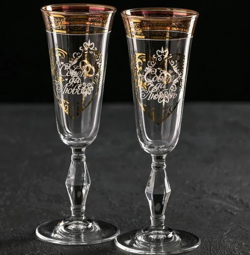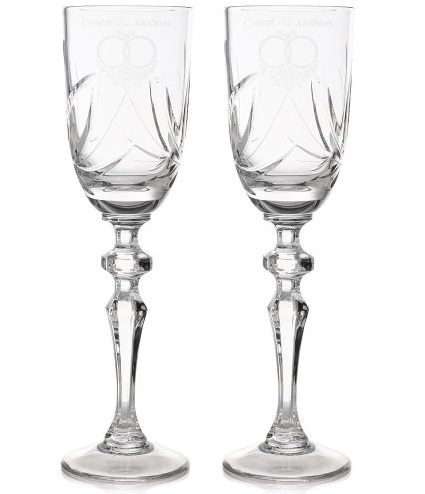 The set contains two glasses with laser engraving "Advice and Love". It is pleasant to hold the dishes in your hands, drink champagne and other wines from it. There is no better gift for the newlyweds for a wedding. After all, later the glasses will become an adornment of the family hearth and a memory of this significant event in life.