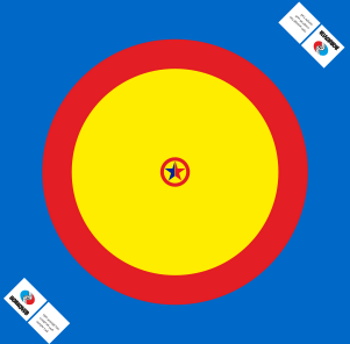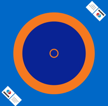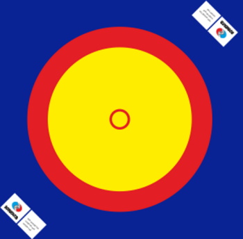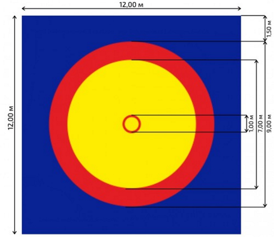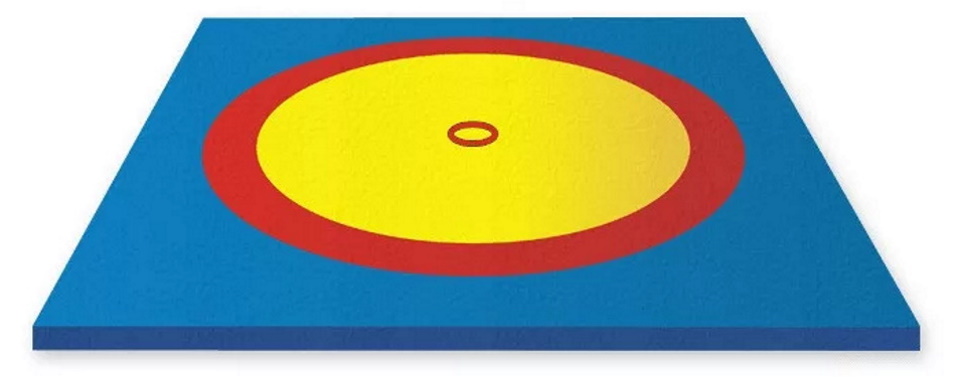 Sports equipment for use in training and tournaments in sambo, judo and other types of wrestling. Above, there are circles in yellow, blue and red in accordance with the current standards, fastened with strong welds no more than one millimeter thick. The cover is attached to the mats around the perimeter using eyelets. The product consists of 72 PPE mats with dimensions of two by one meter, five centimeters thick, with a density of up to 180 kg / m3... The total weight of the product is 500 kg.