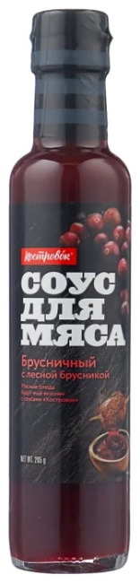 An original additive for meat dishes with an expressive bitter-sour-sweet taste of Russian production. Moderately thick product of rich burgundy color, containing small particles of lingonberry. The glass bottle is closed with a flip-top lid without twisting. A sauce with a spicy aroma. The composition, along with natural ingredients, includes artificial additives. The sauce consists of berries, water, concentrated cherry and orange juices, adjika, sugar, glucose-fructose syrup, applesauce, salt, xanthan gum, stabilizer E459, thickener - E1442, potassium sorbate, sodium benzoate.