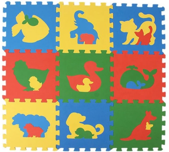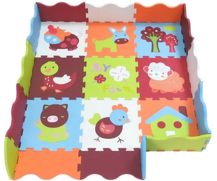 The mat is intended for a child from 1 year old. It not only protects the baby from accidental injury, but also contributes to his mental development. Colored squares will help you learn the basic colors. The photo clearly shows that in each sector there is an insert in the form of an animal.It can be taken out and put together for the development of fine motor skills of fingers and for studying domestic animals.