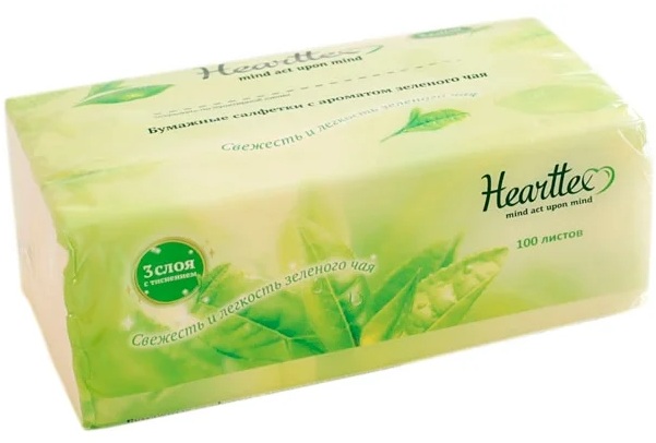 Green tea scent paper napkins in cellophane wrapping. On the outside there is a dashed line that needs to be cut with scissors to transform the holes for easy picking of scarves. Each design is embossed in the shape of a tea leaf. The shape of the canvas is rectangular.