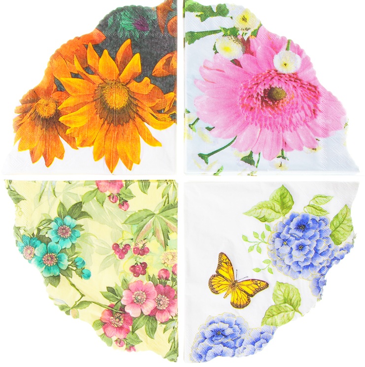 Round paper napkins with a wave pattern on the edges. The scarf itself has several compositional design solutions. The product can be used as an accessory on home or catering tables. It is packed in a plastic bag.