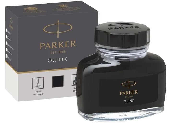 This ink from the famous brand "Parker" is produced in France.They come in three color options: black, blue and blue-black. Parker Bottle Quinks are available in a glass bottle with a plastic cap. The roof has a corporate logo and brand name. Also on the bottle itself there is a label in the same color as the ink. The color of the ink is also indicated on the box in the form of a colored square.