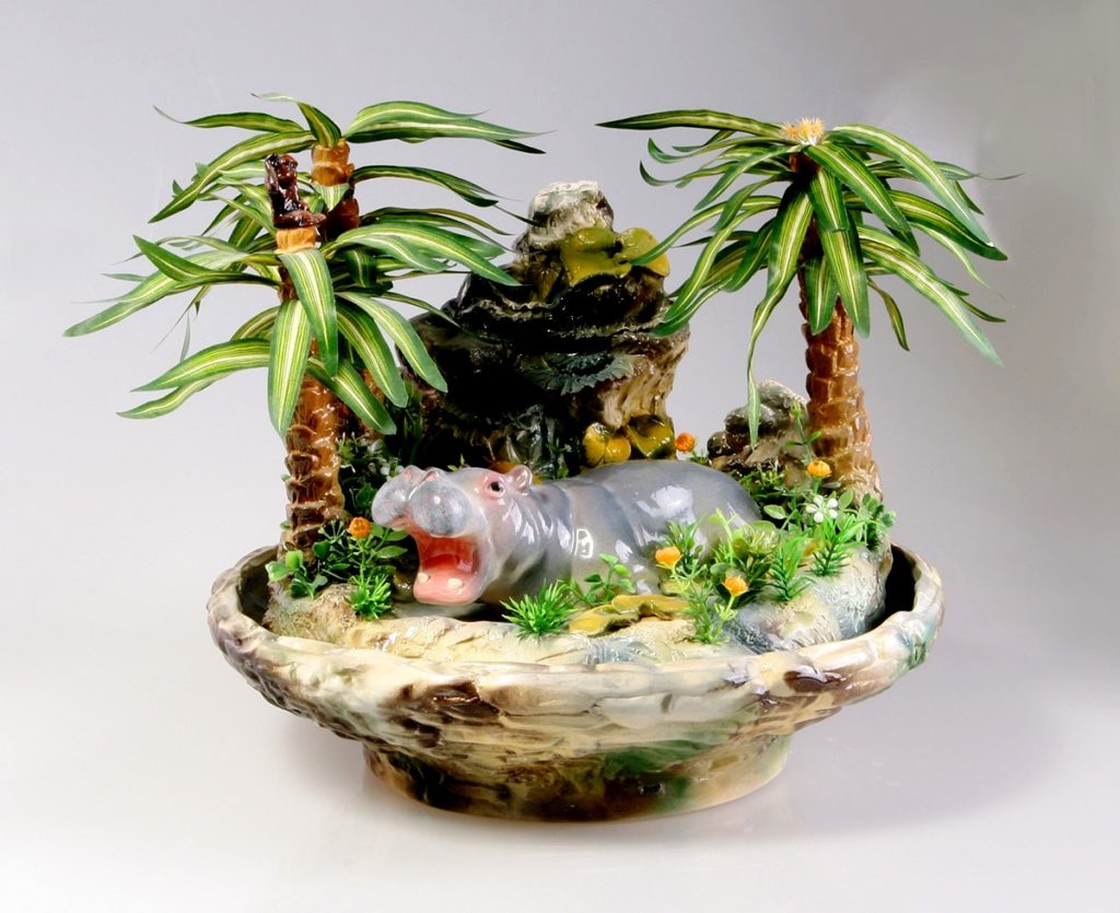 The compact home fountain is more funny than serious. The exhibition features three palm trees and a hippo against the backdrop of a rock. Dimensions: 36 * 42 * 42 cm, weight - 9 kg. The manufacturer produces goods from environmentally friendly noble porcelain. Its safety is guaranteed by a quality certificate. An original gift for the younger generation, nature lovers, connoisseurs of beauty.