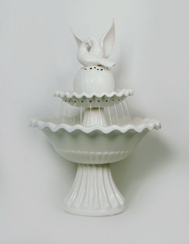 Despite its considerable height (65 cm), it is customary to install the structure on a table. The fountain is covered with milk-white glaze. Two pigeons perched on a hill and coo gently. The water originates in the upper part of the ball, where the figures are, and, through thin metal pipes, flows first into a small bowl, and then into a large one. Spectacular decoration of the wedding table.