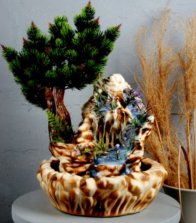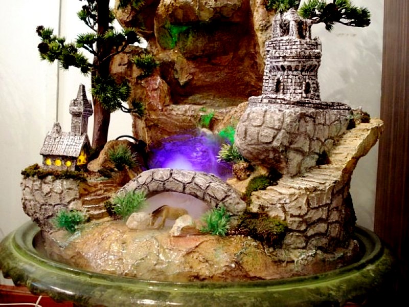 | Tabletop | A distinctive feature is its small size and reasonable price. But manufacturers produce models that reach one meter in height. Basically, they are placed in ceramic or plastic flowerpots, ennobled with flowers and moss, a bonsai tree is placed next to it or stones are laid out. They are usually sold backlit. Equipped with a silent pump. |