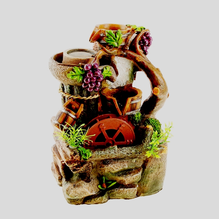 Water pours in two streams: one - onto the wheel, which starts spinning under pressure, the other - from a jug. You can order a product with colored fog, or put an animal next to it, for example, an elephant.