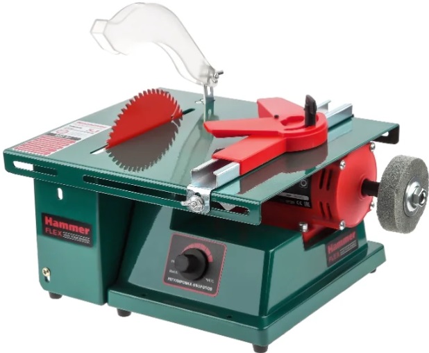 The mechanism with a cutting disc with a diameter of 216 mm works neatly, creates a clean cut, pulls small chips into a dust collector, which is easy to clean. The compact body is made of thick, sturdy plastic. The working surface of 500 * 658 mm does not have additional expansion.