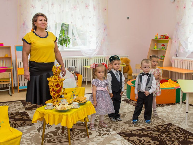 Currently, the kindergarten accommodates 13 age groups: 3 younger, 4 middle, 2 older (1 speech therapy) and 4 preparatory to school (one of them speech therapy). Children are accepted from 3 years old. Upbringing and education is conducted in two languages: Russian and Tatar.