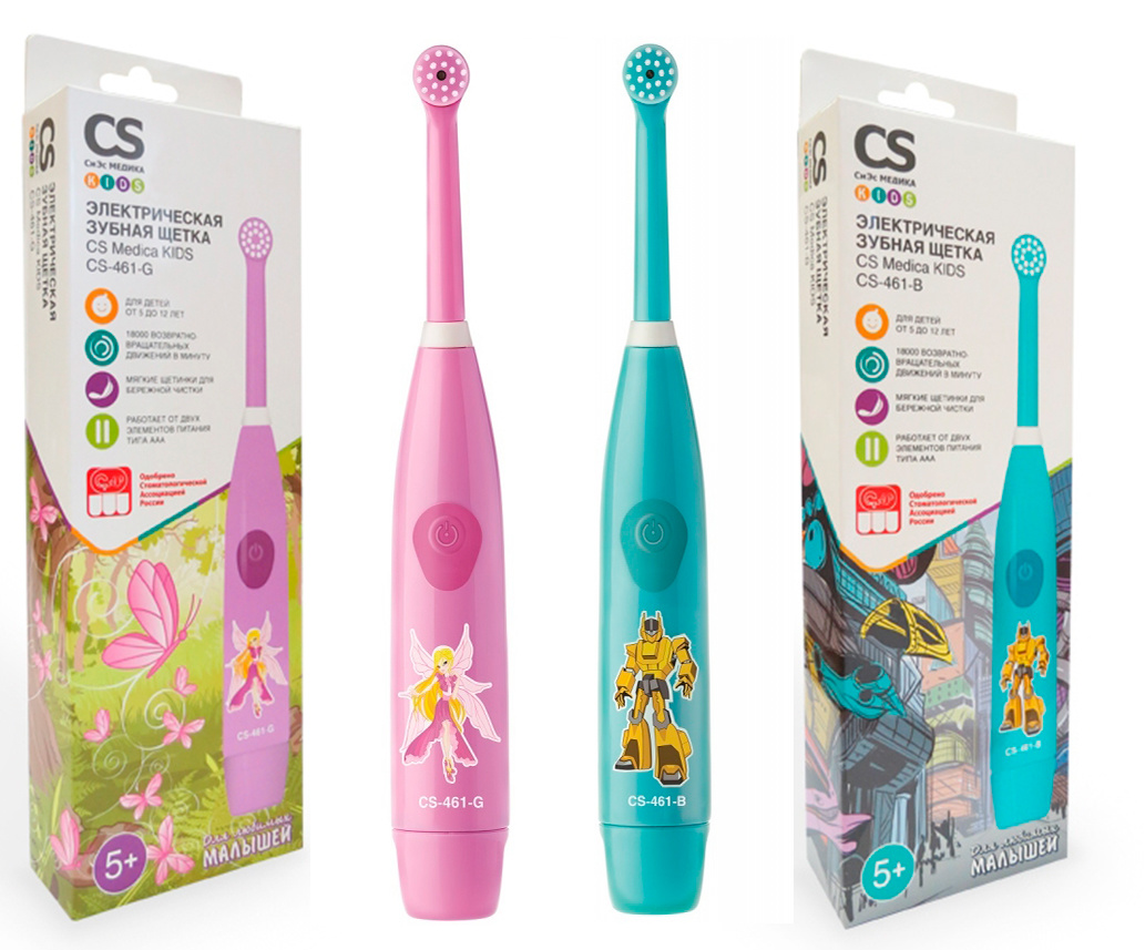 Electric toothbrush for children 5-12 years old. Has two versions: for boys - in blue with the image of a transformer, for girls - in pink with the image of a fairy. Laconic design without unnecessary details. Powered by two AAA batteries. Replacement of nozzles is provided.