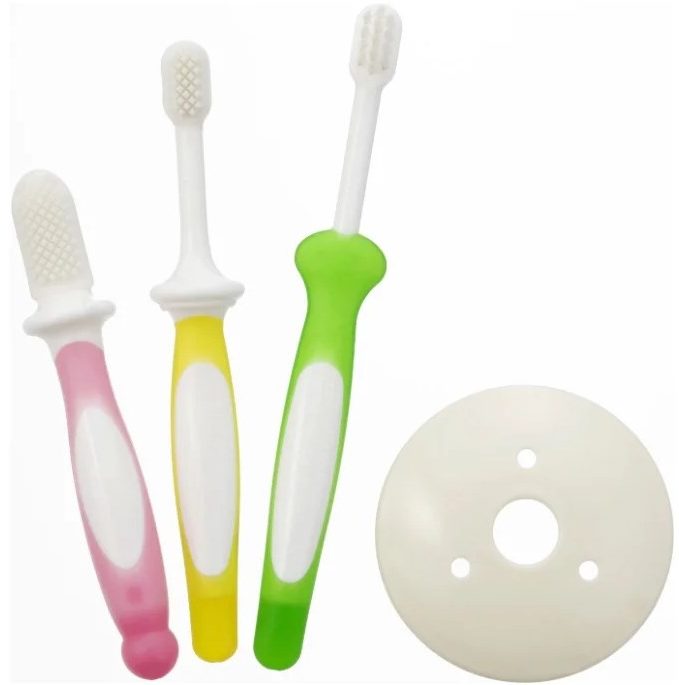 This option from a Japanese manufacturer is a set of 3 brushes for different ages of the child. Application is recommended from teething up to 3 years. This kit allows you to get your baby used to oral hygiene step by step. The first brush in the set (pink) helps the child relieve teething discomfort and get used to the need for oral hygiene. The double-sided rubber bristles are soft, bristles of varying length and thinning towards the end. The second (yellow) is recommended for use after the appearance of the front teeth. One-sided silicone bristles. The third (green) is for children over a year old. It is designed to teach children to brush their teeth on their own. The bristles are already made of ordinary material.