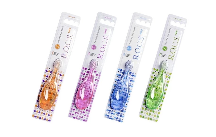 R.O.C.S. Baby is intended for cleaning the teeth of children from the first tooth up to 3 years. Available in 4 colors: orange, pink, blue and green. Ultra-soft bristles are gentle on the delicate gums and fine enamel of babies. The unique wide handle makes brushing your teeth safe - does not penetrate the brush deeply.
